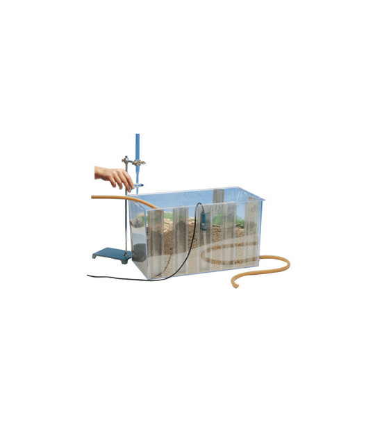 Model hladiny podzemní vody. Ideální při přebírání tématiky životního prostředí. Lze použít i při pokusech podporovaných počítačem. Studenti mohou sestavit maketu hladiny podzemní vody. Nádoba je naplněna pískem a vodou, jejíž hladina představuje hladinu podzemní vody a studenti ji sledují v různých „stádiích“. Hladiny jsou závislé na zdroji, proudu, povaze a pórovitosti půdy; proud se ovládá tlačítkem na pryžové trubici. Model umožňuje zkoumat také prameny, řeky, znečištění atp. Měření lze provádět v různých hloubkách. Jeden z pramenů se může změnit, což umožňuje různé variace pokusů. Další možnosti použití: vysušení nebo filtrace řeky, vliv různých faktorů na tok a hladinu vody, demonstrace rizik spojených s kontaminací podzemní vody v případě vysušení, srovnání turbulencí v řece za silného deště, simulace znečištění sledováním pH (klasické nebo počítačem podporované měření pH). Složení: obdélníková nádoba z průhledného plastu o rozměrech 450mm x 250mm x 250mm, 5 půlkruhových síťových válců z nerezavějící oceli, připevněných k jedné stěně nádoby, půlkruhový síťový válec na druhé stěně nádoby, pryžová hadice, plastová síťovina. Dodává se s návodem k použití. Nezbytné příslušenství: laboratorní stojan SYSDIDAC, pH metr, Mohrova tlačka s pružinou, písek a štěrk pro naplnění nádoby, vápno.