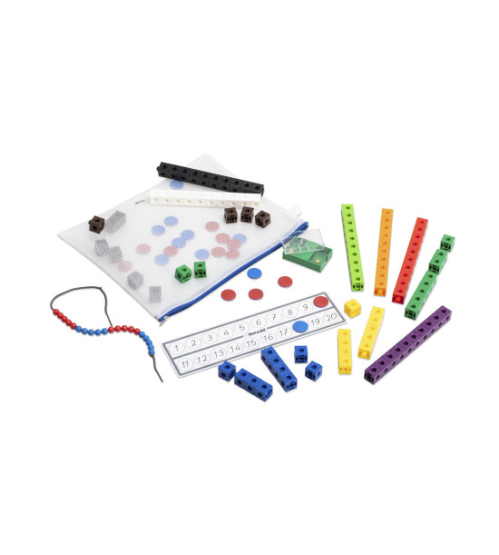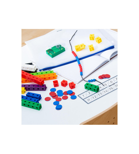 Tato souprava v praktickém sáčku na zip obsahuje vše, co malí školáci potřebují k procvičování počítání do 20. V průsvitné tašce se zipem se nic neztratí. Na první pohled uvidíte, co je uvnitř. Obsah: 100 ks pojitelných kostek s hranou 2 cm. Kostky lze použít pro znázornění lineárních principů počítání. Díky tomu je velmi snadné srovnávat množství, třídit, sčítat a odečítat. Šňůrka s 20 barevnými korálky Oboustranné pravítko s 20 políčky a 22 barevných žetonů Multi-Split box