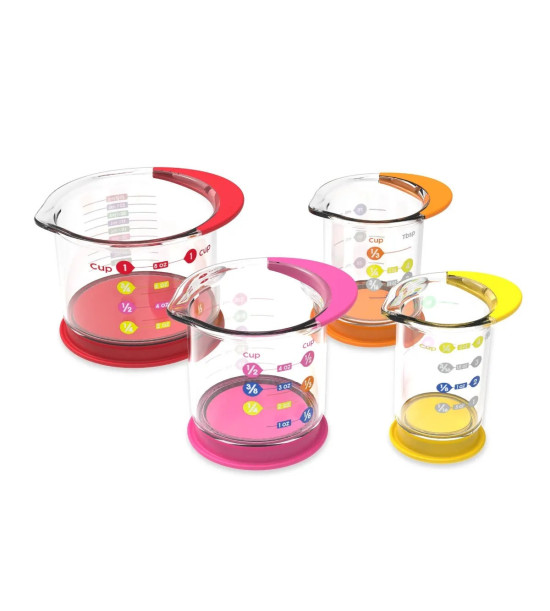 Nalévejte, měřte, seznamujte se s objemem a zlomky pomocí barevných odměrek na tekutiny a značkou Learning Resources. Jednotlivé šálky do sebe zapadají, čímž jsou pohodlně skladovatelné. Odměrky jsou barevně odlišeny. Sada 4 hrníčků obsahuje: 1 celý hrníček (červená) = 1 cup = 8 oz 1/2 hrníčku (růžový) 1/3 hrníčku (oranžový) 1/4 hrníčku (žlutý) Průhledné odměrky jsou bezpečné pro potraviny a vhodné do myčky nádobí. Mají měkké, snadno uchopitelné vršky s nalévacími hubicemi a ochranou proti rozlití. Jsou ideální pomůckou pro učení se doma i ve třídě. Rozměr největšího šálku: 7,5 cm x 9 cm. Vhodné pro děti od 3 let.