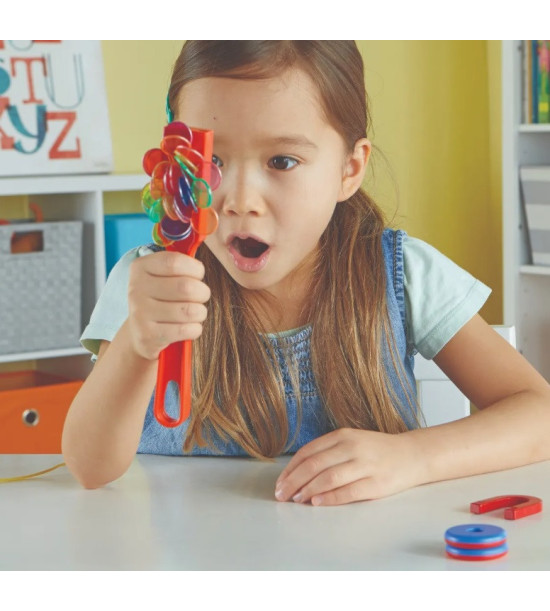 Hravou formou se děti naučí o polaritě, magnetické síle, odpuzování a dalších vlastnostech magnetů a zmagnetizovaných dílků ze sady, jakož i jiných předmětů ve třídě nebo doma. Děti se skvěle zabaví při provádění experimentů a budou sledovat, jak se magnety navzájem přitahují nebo odpuzují, jak magnety dokáží pohybovat předměty a ještě mnohem víc! Obsahuje magnetickou hůlku, magnetickou tyčinku, 2 magnetické kroužky, tyčový magnet, 2 magnetické kuličky, magnet ve tvaru podkovy, šňůrku, 30 barevných žetonů s kovovými kroužky. 39-dílná sada.