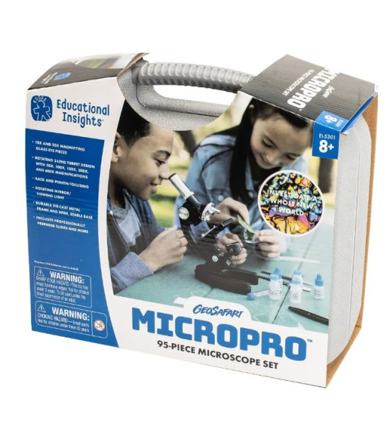 Sada obsahuje profesionálně připravené preparáty, ale také prázdná mikroskopická sklíčka, aby si děti mohly připravit vlastní. Sada je také vybavena zařízením vhodným pro děti včetně pipety, Petriho misky, zkumavky, skalpelu a pinzety. Vyžaduje 2x AA baterie, které nejsou součástí balení. Vhodné pro děti mladšího školního věku.