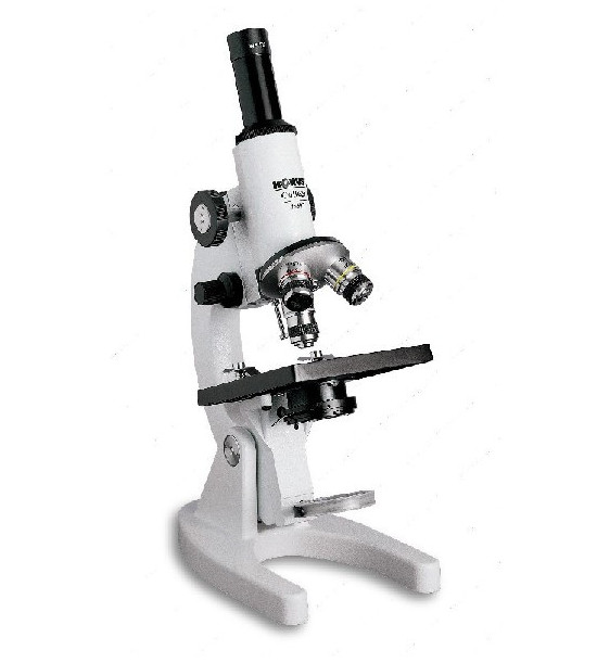 Studentský biologický mikroskop s kovovým tělem a skleněnými achromatickými čočkami. Zvětšení do 600x. Biologický mikroskop s monokulární hlavou, 15xWF okulárem a třemi výměnnými achromatickými objektivy: 4x, 10x, 40x. Dvojitá zaměřovací regulace, mikro a makrometrický, vysouvací držák, clony s filtrem, kryt proti prachu.