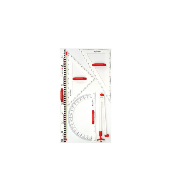 7dílná magnetická souprava rýsovacích pomůcek na tabuli obsahuje kružítko s magnety, magnetický trojúhelník rovnoramenný i nerovnoramenný, magnetický úhloměr, magnetické rovné pravítko, ukazovátko a praktický držák na zeď. Ploché magnety na zadní straně pravítek a noha kružidla s magnety zajišťují stabilitu těchto rýsovacích pomůcek na magnetické tabuli. Pro pohodlnou manipulaci jsou tabulová pravítka opatřena pevnou rukojetí. Abyste mohli mít své rýsovací pomůcky vždy připravené při ruce, je součástí soupravy i odkládací nástěnný panel, na který lze rýsovací potřeby uložit. Přiložen je i montážní materiál pro připevnění panelu na stěnu. Obsah: 1ks tabulové kružítko s magnety 1ks tabulový magnetický trojúhelník nerovnoramenný / 60cm 1ks tabulový magnetický trojúhelník rovnoramenný / 60cm 1ks tabulový magnetický úhloměr / 50cm 1ks tabulové magnetické 105 x 58,5cm