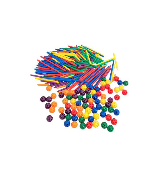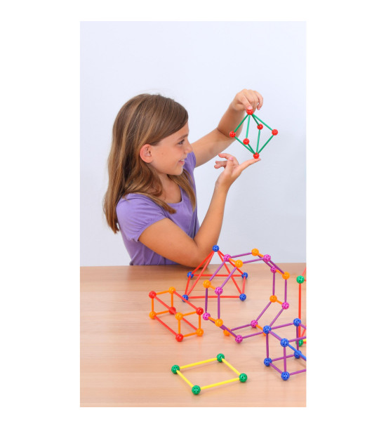 Sada 330ks základních stavebních prvků (hrany a uzly) pro tvorbu rovinných a prostorových útvarů. Objevujte kostky, pyramidy, hranoly, jehlany a další. Vysvětlete pojmy jako strana, plocha, povrch a to vše díky kuličkám a hůlkám, které můžete jednoduše spojovat. Hůlky různých délek (4 - 13 cm) jsou barevně odlišeny. Vyrobeno z trvanlivého plastu. 80 kuliček a 250 barevných hůlek.