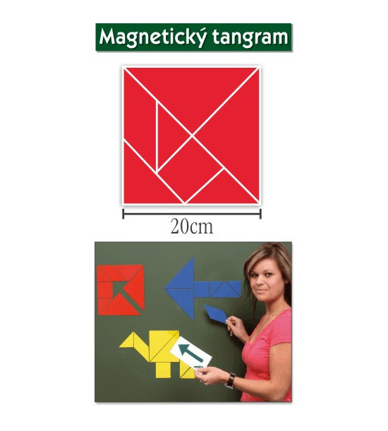 Magnetický tangram vyrobený z hrubého barevného a pevného plastu ve 3 barvách. Ze 7 základních geometrických tvarů mohou děti tvořit nejrůznější představy obrazců od jednoduchých po nejsložitější. Výborná demonstrační pomůcka na magnetickou tabuli.