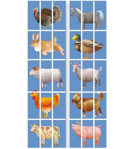 Kobercová skládačka - zvířátka z farmy. Materiál: polyester. Spodní vrstva je protiskluzová. Sada obsahuje 10 zvířátek ve 3 částech. Úkolem dětí je správně sestavit jednotlivá zvířátka, nebo dělat kombinace a vytvářet tak zábavné nové druhy zvířat. Rozměr 1 části: 43,5 x 29 cm.
