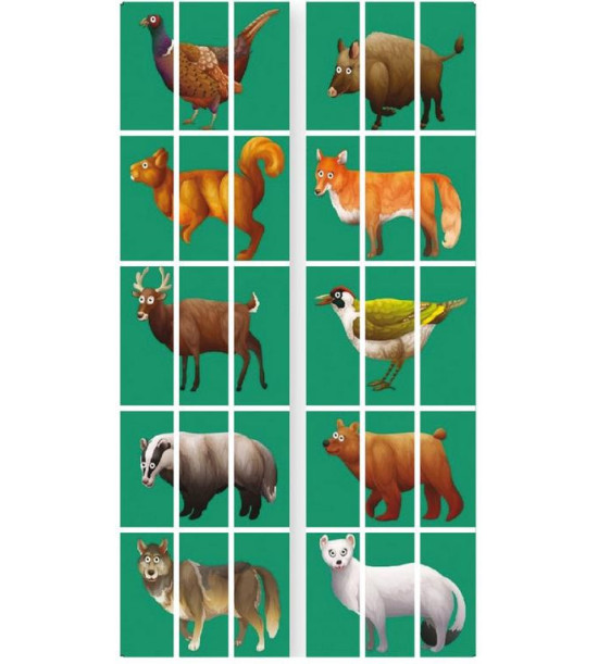 Kobercová skládačka - zvířátka z lesa. Materiál: polyester. Spodní vrstva je protiskluzová. Sada obsahuje 10 zvířátek ve 3 částech. Úkolem dětí je správně sestavit jednotlivá zvířátka, nebo dělat kombinace a vytvářet tak zábavné nové druhy zvířat. Rozměr 1 části: 43,5 x 29 cm.