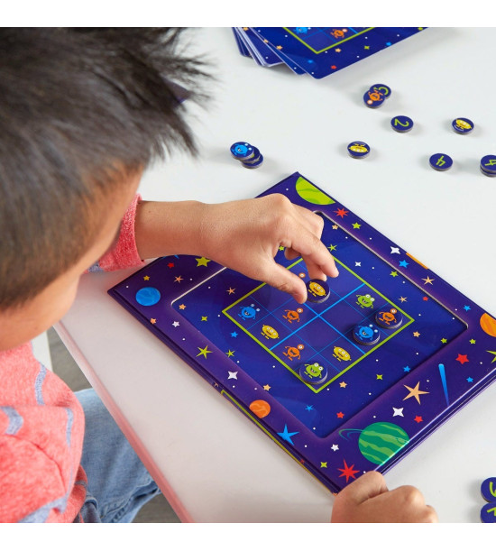 Toto zábavné sudoku pro děti nabízí 72 her, které lze hrát doma nebo na cestách. Hraní zábavných matematických her sudoku pomáhá dětem budovat kritické myšlení a logické dovednosti prostřednictvím řešení poutavých logických hádanek. Vyberte si ze dvou různých typů hádanek – vyřešte tradiční úkoly sudoku založené na číslech nebo pracujte na svých vizuálních logických schopnostech v hádankách, kde čísla nahradí barevní mimozemšťané. Náročnost logických her v této sadě sudoku se zvyšuje, což znamená, že děti si zahrají s tímto magnetickým sudoku po delší dobu, dokud zvládnou i vyšší obtížnosti. Balení obsahuje 36 oboustranných hracích karet, 36 magnetických figurek a magnetickou hrací desku. Nevhodné do 3 let. Doporučený věk 4 – 8 let.