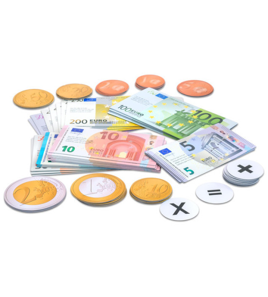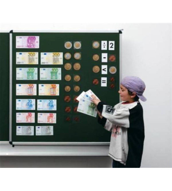 Demonstrační magnetická Euro-sada obsahuje 1 registrační pokladnu s třídicími přihrádkami a plastovým krytem, 40 ks bankovek (5x 200 €, 10x 100 €, 5x 50 €, 5x 20 €, 10x 10 €, 5x 5 min 2 €, 10x 1 €, 5x 0,50 €, 5x 0,20 €, 10x 0,10 € t, 5x 0,05 €, 5x 0,02 €, 10x 0,01 €, znaménka matematických operací ( + ,-,=...). Na přední straně je barevný potisk s reálným vyobrazením eurobankovek/mincí. Zadní strana je pokryta magnetickou fólií. Sada obsahuje nové bankovky 5 € a 10 €. Vhodné pro magnetickou tabuli. Rozměry bankovek: délka 15 – 24,4 cm, šířka 7,6 – 10,2 cm. Průměr mincí: 5 - 8 cm Baleno v plastovém boxu.