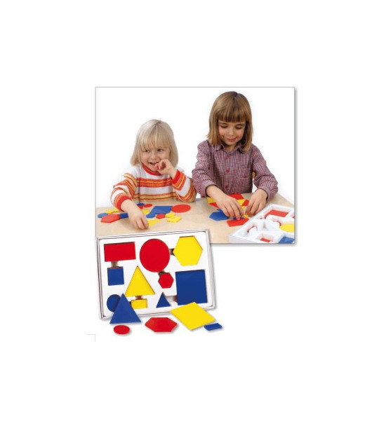 Univerzální pomůcka obsahuje pět základních geometrických tvarů (kruh, čtverec, obdélník, trojúhelník a šestiúhelník) v kombinacích dvou rozměrů, tří barev (žlutá, modrá a červená) a dvou tlouštěk. Vhodná pro předškolní věk (poznávání tvarů, tříd...).