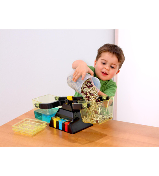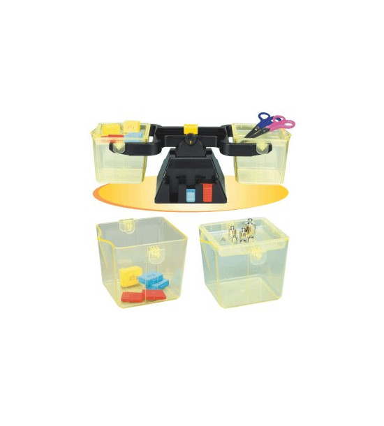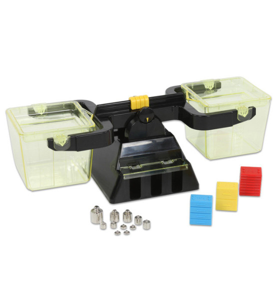 Univerzální školní váha se 2 plastovými nádobami. Tato váha je speciálně vyrobena pro základní školy tak, aby děti získaly co největší zkušenost s vážením. Obsahuje: 2 plastové nádoby s víčky, každá s obsahem 1l, z boční strany mají své měřítko. V podstavci je umístěna sada závaží: Kovová závaží 11ks - 2x1g, 2x2g, 2x5g, 2x10g, 2x20g, 1x50g. Plastová závaží 14 ks: 4 x 10g, 8 x 15g, 2 x 20g.