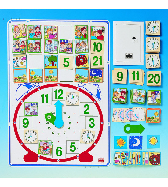 Na základě posloupnosti 25 každodenních činností, rozvíjí tato didaktická pomůcka pojem času, jeho měření a poskytuje kompletní metodiku pro učení se hodin. Obsahuje pedagogický návod.