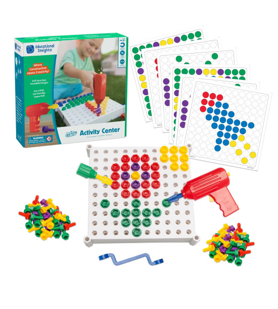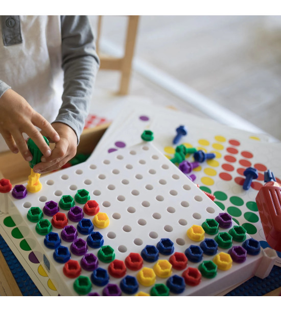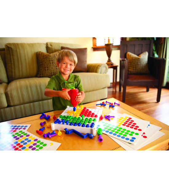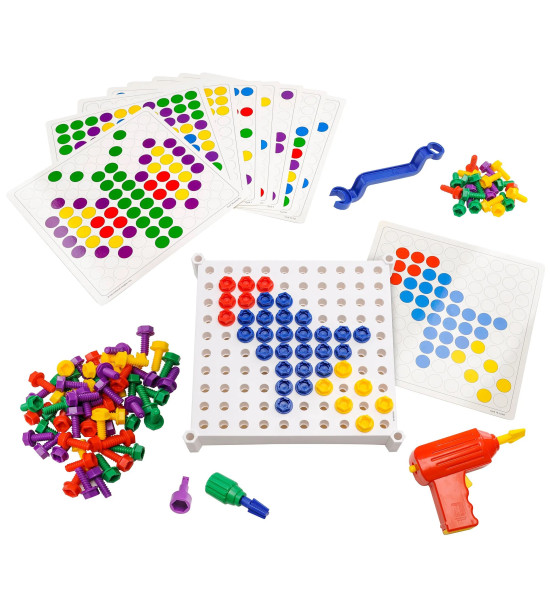 Děti šroubují barevné vzory do šroubovací podložky. Realistické nástroje rozvíjejí ranní dovednosti včetně rozpoznávání barev, počítání, rozvoje motorických dovedností ruky. Sada obsahuje: šroubovák na baterky se zpětným chodem, francouzský klíč, 10 oboustranných vzorových karet s 20 barevnými aktivitami, 100 plastových šroubů v 5 barvách. Šroubovák je napájen 3x "AA" bateriemi, které nejsou součástí sady. Věk 3+