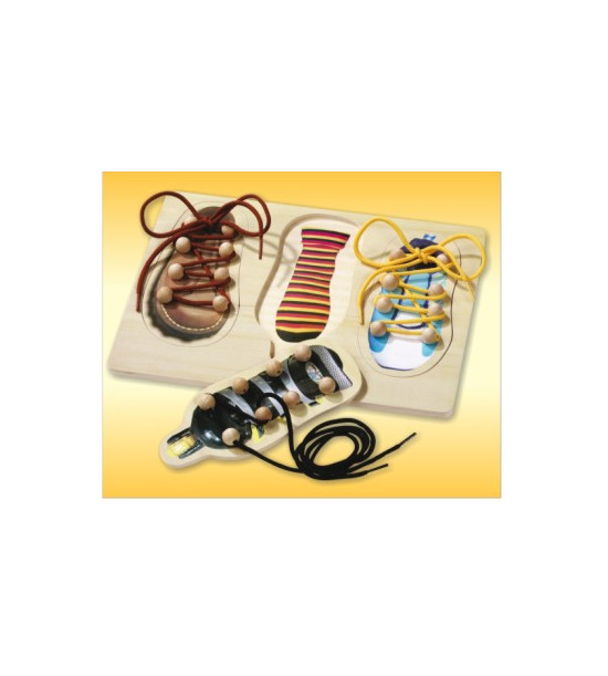 Dřevěné ručně vypílené a barevně potištěné puzzle ve tvaru botiček se šňůrkou na nácvik šněrování. Balení: - deska 40 x 21cm, - 3 botičky cca 19 x 8cm, - 3 šňůrky 130cm.