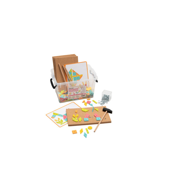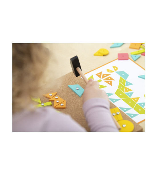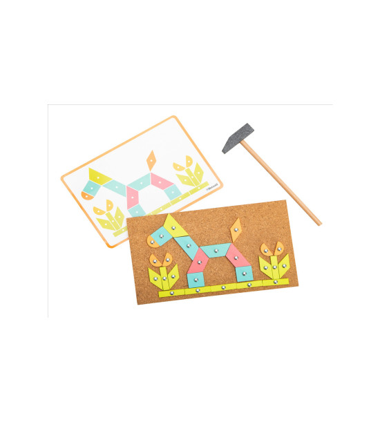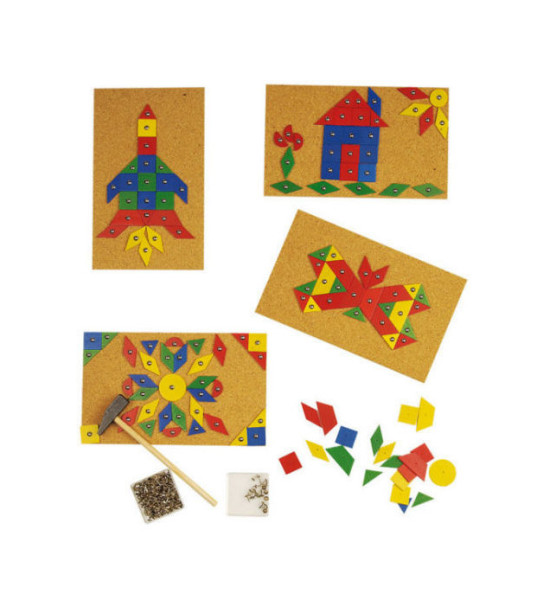 Klasická hra, která nezná věk. Malé kladívko, hřebíček, korková deska a spousta dřevěných geometrických tvarů. Tak jako my v minulosti, tak i naše děti milují tuto nenápadnou, ale chytlavou zábavu. Dokážou s ní strávit celé hodiny, rozvíjet tak jemnou motoriku, trpělivost, představivost a estetiku. Dodáváno jako následující komplet: -4x korková deska 50x30cm, -4x dětské kladívko, -200 dřevěných částí - 9 geom. tvarů ve 4 barvách, -250 hřebíčků v plastové krabičce. Objednat lze i samostatné komponenty pro pozdější doplnění chybějících částí.