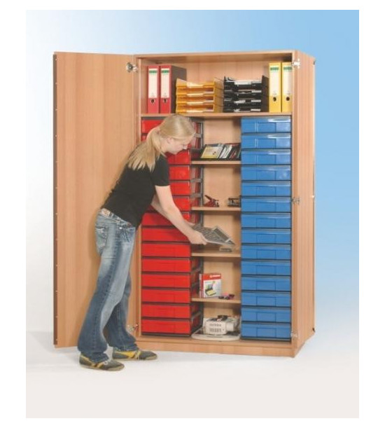 Praktická uzamykatelná skříň do třídy nebo kabinetu pro přehledné odkládání učebních pomůcek, hraček, sportovních potřeb, úborů, dokumentů. Skříň obsahuje kontejnerový systém InBox, který vyniká variabilitou, barevností, praktičností. Korpusy skříní jsou vyrobeny z laminované dřevotřískové desky 18 mm tloušťky různých dezénů. Ohraněné jsou 2 mm ABS hranami. Panty jsou navrženy tak, aby se dveře daly otevřít o 270 stupňů. Barvy InBox krabic jsou průhledná (vidět, jaký obsah je v krabici), červená, modrá, žlutá, zelená.