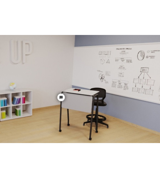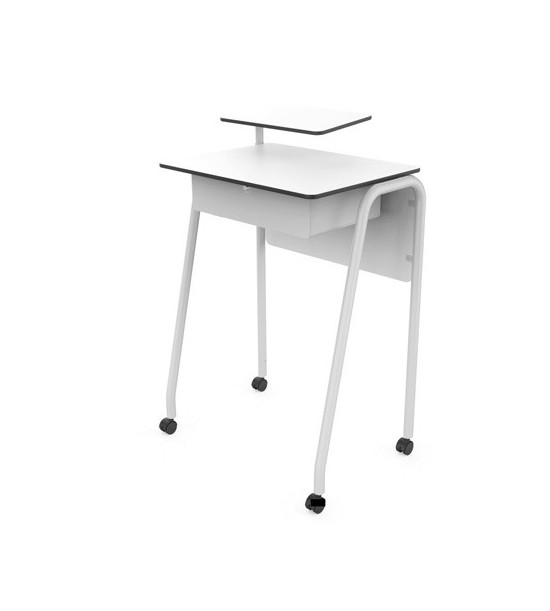 Učitelský 1-místný stůl, pro práci ve stoje, výška 102,5 cm. Vrchní deska tloušťky 13mm. Vhodný pro kolaborativní vyučování. Rozměry (délka x šířka x výška): 70 x 55 x 102,5 cm. Všeobecné vlastnosti: Stoly mají konstrukci z trubky o průměru 35x2 mm v obráceném tvaru „U“. Pod vrchní deskou je odkládací prostor s bočními stranami, spodní a přední hranou. - Vlastnosti stolové desky: vrchní dřevovláknité desky Compacmel® s vysokou hustotou vláken a melaninovým povlakem mají VYSOKOU MECHANICKOU PEVNOST a jsou odolné vůči vlhkosti. Vrchní deska je tloušťky 13mm, se zaoblenými rohy. Barvy desky: světle šedá, bílá. - Vlastnosti kovového rámu: nátěr epoxidovou pryskyřicí, barvy: antracitová RAL 7021, šedá RAL 7035. - Nohy stolu s kolečky. Cena instalace a dopravy se kalkuluje samostatně.