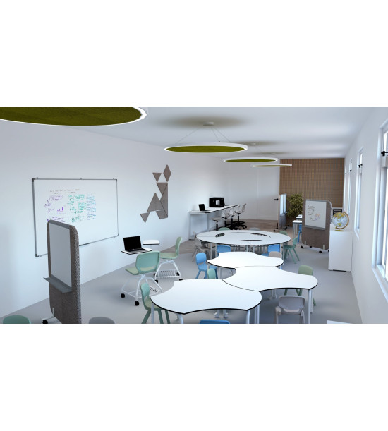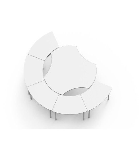 Žiacky stôl výškovo nastaviteľný, vrchná doska hrúbky 13mm v tvare KRUHU S VÝREZMI. Vhodný pre pravákov aj ľavákov. Rozmery (dĺžka x šírka x nastaviteľná výška pre veľkosti 2-3-4): 130 x 121 x 52-58-64 cm. Oblé nohy stola v tvare obráteného UVšeobecné vlastnosti: - Konfigurácie: SAMOSTATNÝ ALEBO SPOJENÝ DO RÔZNYCH TVAROV v rámci školského priestoru. - Stoly sú ERGONOMICKÉ a univerzálne na písanie PRE ĽAVÁKOM AJ PRAVÁKOM. Stoly sú VHODNÉ PRE ŽIAKOV SO ZDRAVOTNÝM ZNEVÝHODNENÍM. - Stoly sú VÝŠKOVO NASTAVITEĽNÉ. - Vlastnosti stolovej dosky: vrchné drevovláknité dosky Compacmel® s vysokou hustotou vlákien a melanínovým povlakom majú VYSOKÚ MECHANICKÚ PEVNOSŤ a sú odolné voči vlhkosti. Vrchná doska je dostupná v RÔZNYCH TVAROCH (trojuholníkový, lichobežníkový, šesťuholníkový, obdĺžnikový, polkruhový, kruhový s výrezmi, bumerang/delta). Farby dosky: svetlo šedá, biela. - Vlastnosti kovového rámu: náter epoxidovou živicou, farby: antracitová RAL 7021, šedá RAL 7035. - Odnímateľná konštrukcia pre ľahšiu prepravu, dodávané v demonte. Jednoduchá montáž a demontáž. Cena inštalácie a dopravy sa kalkuluje samostatne.