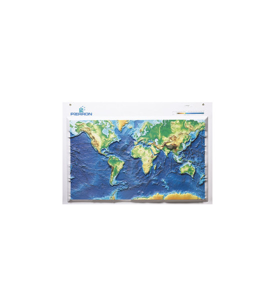 Přesné, 3D barevné znázornění reliéfu od dna oceánů po vrcholy kontinentů. Průhlednost v reliéfu, na kterém jsou zobrazeny tektonické desky. Měřítko 1/33 106. Celkový rozměr 135 x 95cm, upevnění na stůl nebo stěnu pomocí dvou oček. Tato mapa, navržená pomocí batymetrických a hypsometrických údajů poskytnutých mapovací společností.