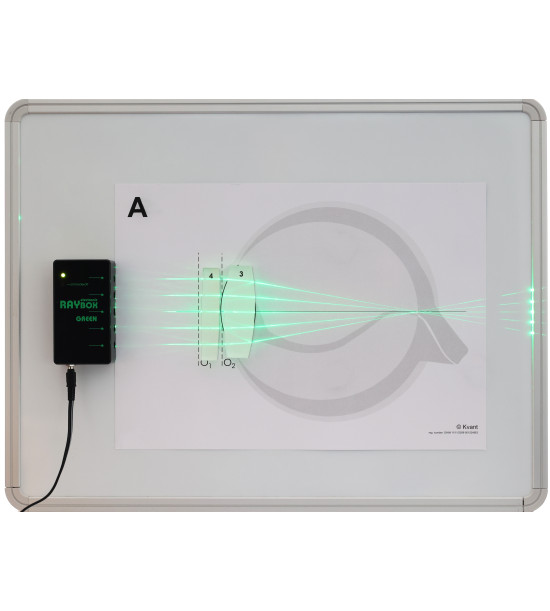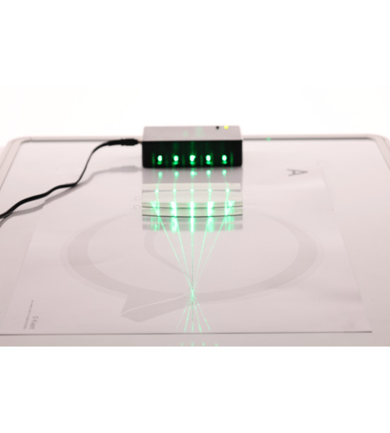 LG5/520 - elektronik je zdrojem 5-ti paralelních paprsků. Jednosměrné roztažení paprsků cylindrickou čočkou umožnilo získat na tabuli dobře viditelné čárové zdroje světla. Využívá laserové moduly o vlnové délce 520 nm. Lidské oko je na tuto barvu citlivější než na vlnovou délku 635 nm. Při stejném výkonu jsou proto zelené paprsky „viditelnější“ než červené. Nepotřebuje clonku na zakrývání paprsků. Pomocí tlačítka se přepíná do výchozích módů: všechny paprsky (1,2,3,4,5) svítí, tři paprsky (1,3,5) svítí, tři paprsky (2,3,4) svítí, jeden paprsek (3) svítí. V kombinaci se soupravami GON nebo GON+ dokážete jednoduše vysvětlit geometrickou optiku, základní optické jevy a principy fungování optických přístrojů. Napájecí zdroj je v ceně. Specifikace: Typ laseru - dioda, vlnová délka - 520 nm, výstupní výkon/třída laseru - Pmax < 1mW/II, vzdálenost paprsků - 18 mm, rozměry - 112 x 62 x 32 mm, napájení - 3V DC / 300 mA