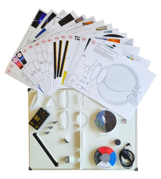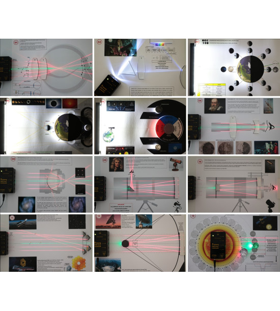 ASTRO LASER SET obsahuje všechny komponenty potřebné k vysvětlení témat a úloh popsaných v manuálu. LED zdroj světla představuje Slunce, 5 paprskový laserový zdroj světla se využívá při vysvětlování principů optických přístrojů. Vesmírná tělesa (Země, Měsíc, exoplaneta), optické prvky (čočky, zrcadla apod.) a zdroje světla se umisťují na pracovní výkresy, které jsou součástí soupravy. Optické moduly lze zároveň použít i na úlohy v manuálu nepopsané, jako například odraz a lom světla, totální odraz a pod.