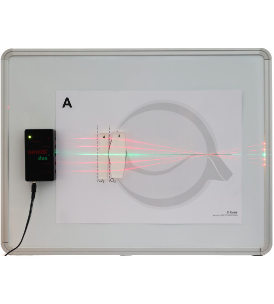 DUO LG5/635,520 laser je zdrojem 5-ti paralelních paprsků a bílého světla. Jednosměrné roztažení paprsků cylindrickou čočkou umožnilo získat na tabuli dobře viditelné čárové zdroje světla. Ke zvýraznění optické osy je pro střední paprsek použit zelený laser, ostatní paprsky jsou červené. Nepotřebuje clonku na zakrývání paprsků. Pomocí tlačítka se přepíná do výchozích módů: všechny paprsky (1,2,3,4,5) svítí, tři paprsky (1,3,5) svítí, tři paprsky (2,3,4) svítí, jeden paprsek (3) svítí. V kombinaci se soupravami GON nebo GON+ dokážete jednoduše vysvětlit geometrickou optiku, základní optické jevy a principy fungování optických přístrojů. Napájecí zdroj je v ceně. Specifikace: Typ laseru - dioda, vlnová délka - 635/520 nm, výstupní výkon/třída laseru - Pmax < 1mW/II, vzdálenost paprsků - 18 mm, rozměry - 112 x 62 x 32 mm, napájení - 3V DC / 300 mA
