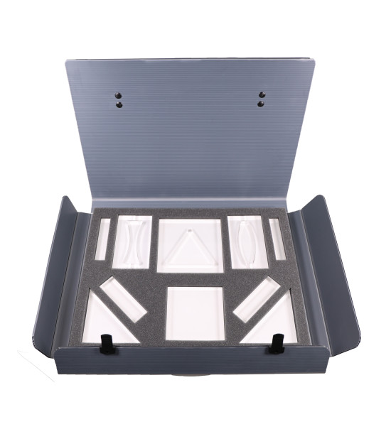 Doplňující sada 15-ti optických modelů umožňuje demonstrovat další jevy z geometrické optiky. Přechod paprsku trojbokým hranolem, maximální deviace, vzduchové čočky, demonstrace vlastností indexu lomu prostředí na vzduchových čočkách, demonstrace různých optických přístrojů, hranolových soustav. Laserový zdroj světla není součástí soupravy. Magnetickou tabule o rozměrech 60x45 cm se dodává s opěrkou.