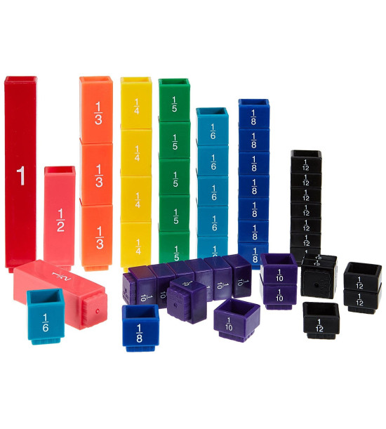 Barevné kostky pomáhají dětem pochopit zlomky. Všechny kostky používají stejné barvy, které ilustrují každou část: červená = 1, růžová = 1/2, oranžová = 1/3, žlutá = 1/4, zelená = 1/5, tyrkysová = 1/6, modrá = 1/8 , purpurová = 1/10 a černá = 1/12 . Jedna úplná část měří 12 cm.