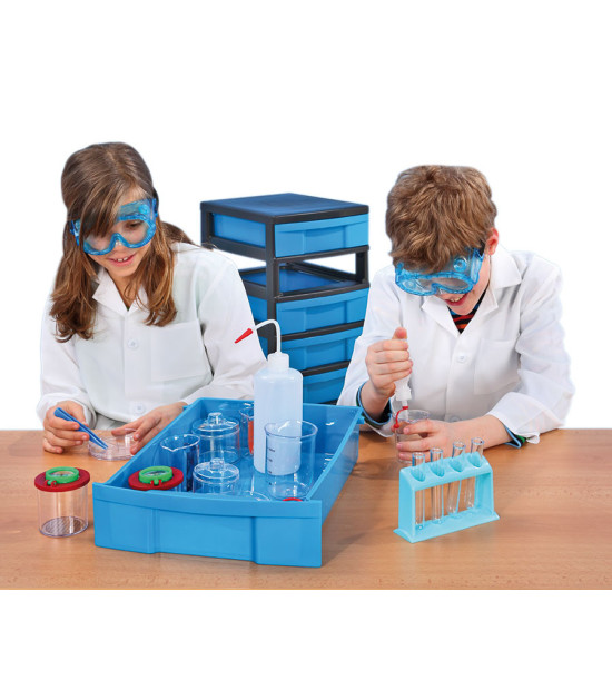 Mobilní laboratoř pro malé výzkumníky. Obsah pro 16 dětí: 16x ochranné brýle, 16x nahlížeč hmyzu, 32x odměrka, 8x sada 3 práškových barev pro pokusy s mícháním barev; 32x zkumavka, 8x držák na zkumavky, 8x pipeta, 24x nádobka 50ml, 8x odměrná lžička, 24x Petri miska třídílná, 8x teploměr, 8x lahvička s kapátkem, 8x promývací láhev (střička), 24x nádoba zvětšením, 1 mobilní kontejner s 8 přihrádkami. Rozměry (vx š xd): 86x30x38cm