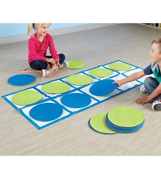 Velké podlahové koberečky pro učení základů počítání interaktivní a zábavnou formou. Děti na rozvíjení matematických dovedností používají barevné kruhové žetony nebo vlastní tělo.
