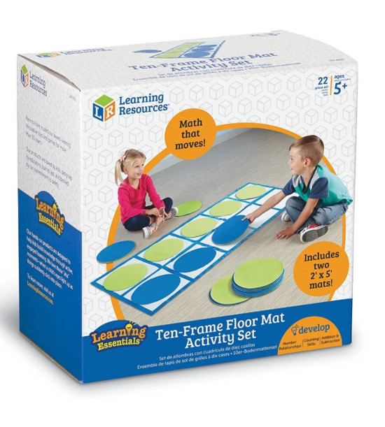 Set podložek pro učení se matematiky s deseti rámečkem. Obsahuje dva podlahové koberečky, každý s deseti rámečky, 20 oboustranných disků (modrá/zelená) a průvodce aktivitami.