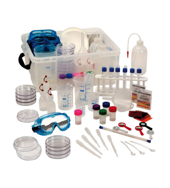 Sada obsahuje: 10ks brýlí, 12ks zkumavek s víčky, 1ks stojan na zkumavky, 2ks vodní filtr, 12ks Petriho misky jednoduché, 9ks Petriho misky, 1ks teploměr, 5ks kapátko, 3ks láhve s rozprašovačem, 100ks míchání, 9ks prášková barva pro barevné experimenty, 10ks plechovek, 5ks odměrky, 3x zvětšovací skla s 5x zvětšením, 2 lupy se zvětšením 10x, 1 úložný box.