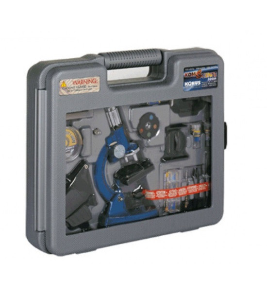 Biologický kovový mikroskop. Celková váha je 900g. Rozměry 65 x 120 x 250mm. Zoom mikroskopu se pohybuje od 100 do 1200 násobného zvětšení s různými funkcemi: zoom mikroskop, viewer, nástěnný projektor, projektor na papíře (např. pro kreslení). Osvětlení zrcadlem nebo světlem, připevnění kamery. Celkem 81 kusů příslušenství v pevném obalu.