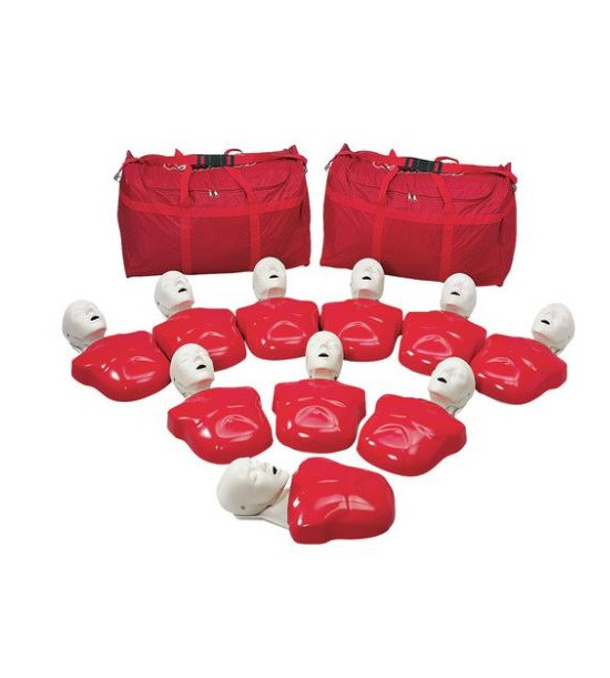 Cenově výhodné figuríny pro výuku první pomoci (PP) jednotlivců a větších skupin. Sterilnosti je dosaženo použitím plic/ochranných obličejových roušek k dýchání z úst do úst. Uvolnění dýchacích cest se zajistí zakloněním hlavy, podložením zátylku a otevřením úst. Viditelné zvedání hrudníku při dýchání z úst do úst. Anatomicky zvýrazněné zakončení hrudní kosti pro správné umístění rukou a směrování tlaku při oživování. Figuríny umožňují výuku resuscitace dospělého i dítěte. Balení obsahuje: 10 figurín, 50 ks jednorázových plic/ochranných obličejových roušek a 1 přenosnou tašku. Hmotnost: 12 kg.