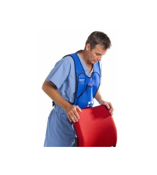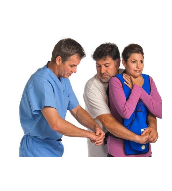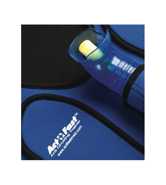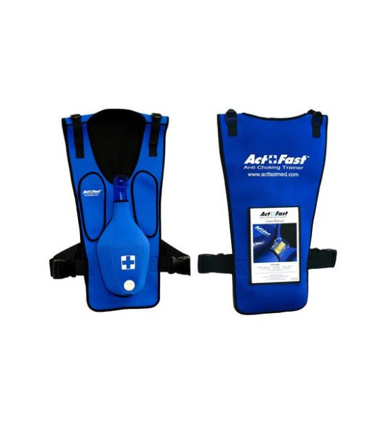 Act+Fast modrá vesta pro dospělé umožňuje procvičovat břišní/hrudní stlačení (Heimlichův manévr) pro uvolnění a vyčištění blokovaných dýchacích cest od cizího tělesa (FBAO). Trenažér obsahuje patentovaný vzduchový vak pro nácvik Heimlichova manévru. Při správném provedení manévru pěnová zátka vystřelí do vzduchu, díky čemuž je trénink zábavný. Trenažér lze použít ve stoje, vsedě, vleže nebo i na sebezáchranu během dušení pomocí pultu nebo židle. Vesta je ideální při výcviku osob ve školách, nemocnicích, hasičských sborech a jiných bezpečnostních organizacích k procvičování záchranných protokolů AHA a Červeného kříže. Součástí je také 10 pěnových zátek a taška na přenášení.