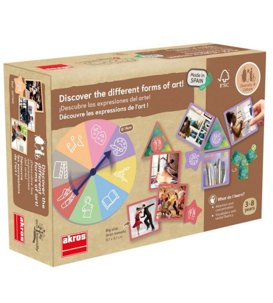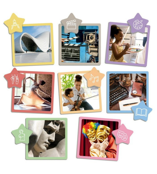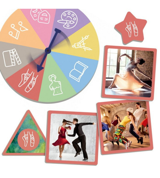 Přiřazovací hra používá skutečné obrázky, které zobrazují různé formy umění – malířství, sochařství, architektura, literatura, kinematografie, divadlo, hudba a tanec. Děti točí ruletou a třídí karty podle druhu umění. Karty mají na zadní straně samokontrolní opravný systém.