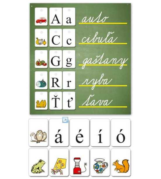 Praktická učební pomůcka při nácviku čtení a psaní jednotlivých písmen abecedy. Velká a malá tištěná písmena + nápovědné obrázky, oboustranně, barevně tištěné. Využití na magnetické tabuli, na lavici při práci žáků. Malá a velká tištěná písmena + obrázky Obsah: 112ks karty / 9,5 x 6,5mm / oboustranně laminovaný karton