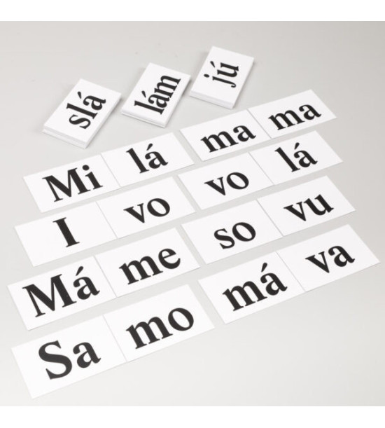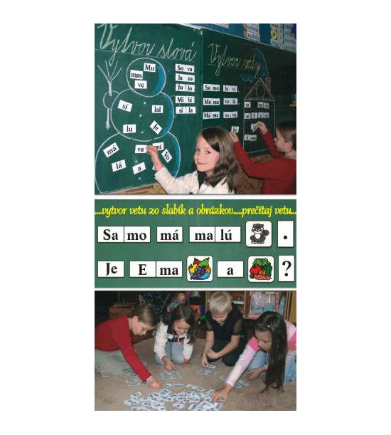 Slabiková skládačka je vhodná do 1.ročníku v 1.polroku jako nácvičná pomůcka k upevnění učiva. Zahrnuje prvních 10 písmen: A,M,E,L,I,V,U,S,O,J přebíraných v současných slabikářích, ze kterých jsou vytvořeny slabiky. Doporučujeme doplnit obrázkovými pomůckami Poslouchej mě jazýček, Pojďme hledat obrázky, Zdravá výživa, Profese aj. na navazující tvůrčí práci. Velké množství kartiček se slabikami umožňuje kombinovat spoustu slov a vět a dává prostor pro práci mnoha žákům či skupinám. Dítě slabiky: - čte - skládá do slov a vět - přikládá k obrázkům a opačně - učí se tvořit slovo ze slabik a učí se ho psát - učí se sestavit větu a napsat ji - větu dotvořit přiložením obrázku Obsah: 189ks kartiček + magnety / 7 ,5 x 4,5cm/2mm pevný karton Kartonová krabice.