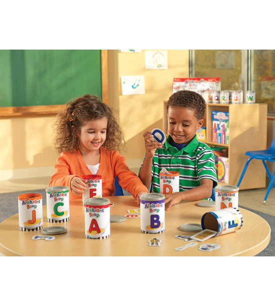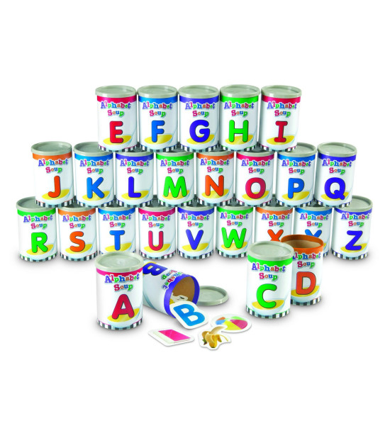 Sada obsahuje plechovky s písmeny. Uvnitř plechovek jsou kartičky: jedno velké písmeno, jedno malé písmeno a 5 kartiček zvířátek nebo rostlin, jejichž názvy začínají na dotyčné písmeno v angličtině. Z jedné strany je obrázek na druhé straně, jak se to zvířátko píše. Děti si budují slovní zásobu a procvičují jemnou motoriku. Obsahuje 26 ks odolných kartonových "plechovek" a kartičky. Plechovky mají rozměr 8 x 10 cm. Věk 3+
