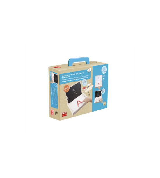 Malé pískoviště s tabulí. Podporuje psaní, kreslení, hraní s válečky, a pod. Pískoviště má průhledné dno, které umožňuje podložení barevného pozadí pro zvýšení efektivity práce. • rozm. dřevěného podnosu 30 x 23 x 4 cm • oboustranná tabule - černá (křída) a bílá (popis fixem) • 3 křídy • 1 stírací houbička • 1 fix • 1 sáček s pískem 0,4kg