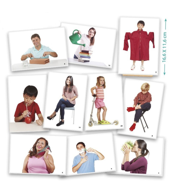 50 fotografií o rozměru 19,5x13,5 cm, které reprezentují běžné situace, na kterých však není vše v pořádku – některý nástroj nebo část oblečení je nesprávně použit. Obrázky pomáhají rozvíjet pozorovací schopnosti, důslednost a koncentraci dětí. Obsahuje pedagogický návod a podstavec pro přichycení fotografií.