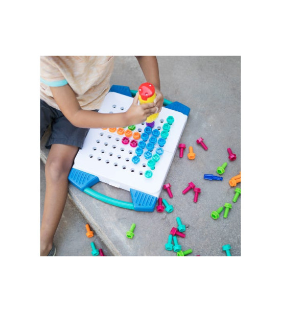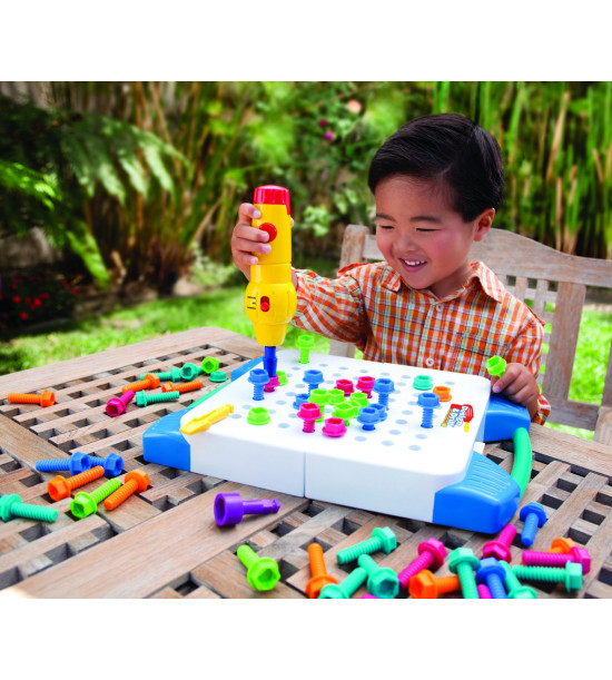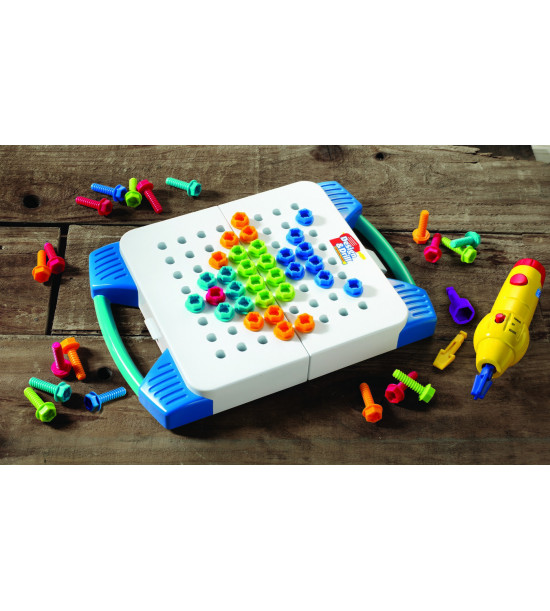 Přenosná sada nástrojů zahrnuje elektrický šroubovák se zpětnou funkcí, vyměnitelné vrtáky, 60 plastových šroubů a příručku s 10 vzorovými obrázky v pevném kufříku, který lze rozložit. Šroubovák obsahuje 3 x "AA" baterie, které nejsou součástí balení. Rozměr: 23x18cm. Věk 3+