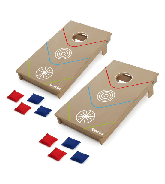 Cornhole je oddechová házecí hra, ve které mohou hrát 2-4 hráči současně. Každý hráč (nebo tým) má 4 sáčky naplněné fazolkami, které hází a snaží se trefit do otvoru (průměr: 9 cm) herní platformy. Za zásah do otvoru se počítají 3 body, za zásah do plošiny se počítá 1 bod. Specifický design herní desky nabízí další zóny a proto lze přidat složitější pravidla pro více zábavy a vzrušení. Kompaktní, přenosné plošiny jsou vybaveny pevnými, skládacími dřevěnými nohama. Sada obsahuje 2 přenosné herní desky (52 x 30 x 14,5 cm) a 8 x 6,5 cm házecí kapsy (4 červené a 4 modré). Plošiny jsou vyrobeny z FSC certifikovaného MDF dřeva.