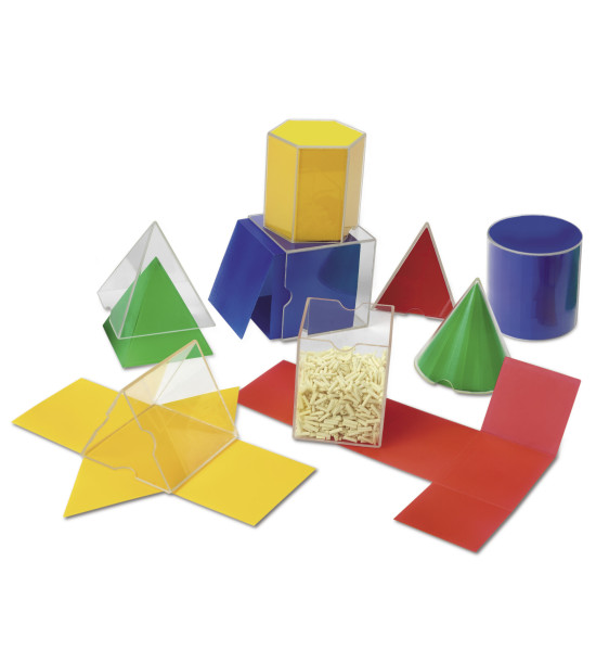 Vhodné pro ilustraci při vyučování symetrie, obvodu, povrchu a objemu. Sada 8 objektů ve dvou částech - průsvitná část ve 3D a barevná část ve 2D. Každý tvar je v rozložené formě a má průsvitné pouzdro. Obsahuje válec, jehlan - čtverc. podstava, kostku, hranol, kužel, šestiúhelník, jehlan - trojúhel. podst., tříboký hranol. Rozměr 8 cm výška. Věk 2+