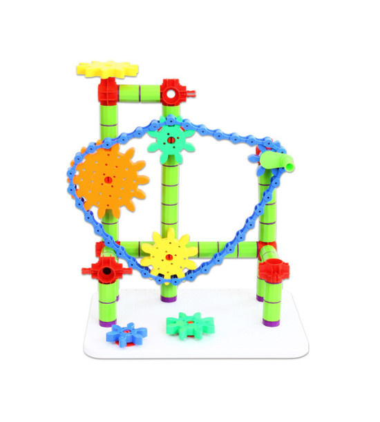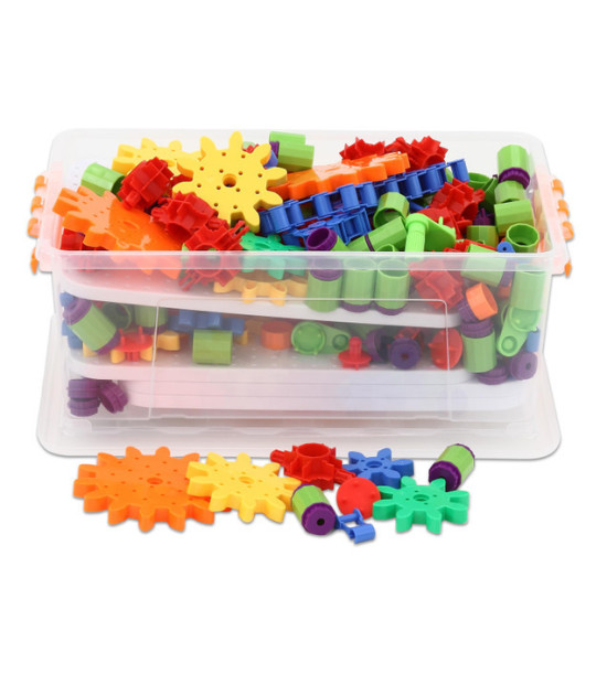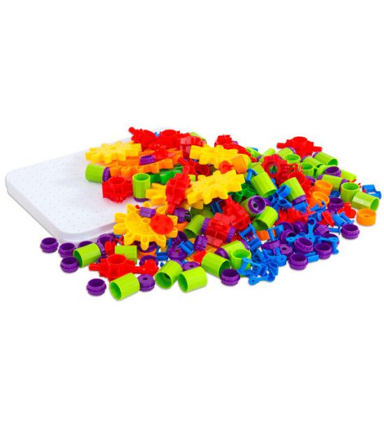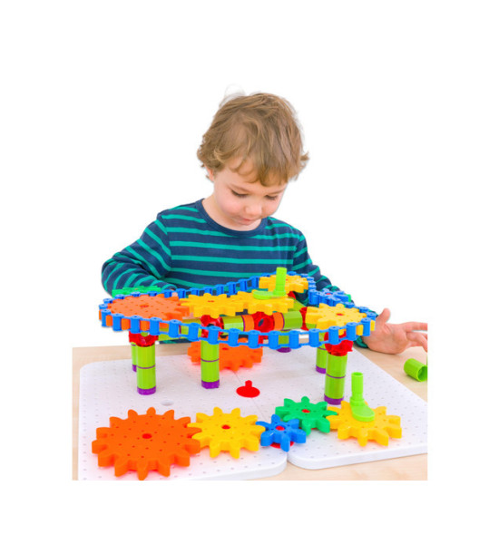 Zkonstruujte sestavu ozubených převodů a rozhýbejte všechna kolečka jednou klikou! Malí designéři sestavují své 2 a 3-dimenzionální modely a učí se tak principu pohonu kola a jiných jednoduchých mechanických převodů. Všechny části jsou zhotoveny z bezpečného nerozbitného omyvatelného plastu. Obsah: 340 částí v praktickém plastovém boxu 41 x 27 x 15,5 cm. Rozměry: pracovní panel 31 x 22 x 1cm; kolečka průměr 11,8cm (velké kolo) - 8,7cm (střední) - 5,8cm (malé kolečko); průměr středového otvoru 0,9cm.
