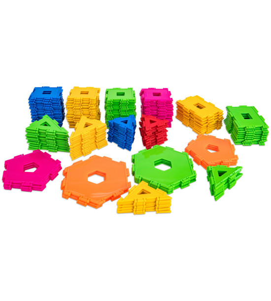 194ks stavebnice v 7 základních geometrických tvarech, které mohou být navzájem spojovány hranami. Každý tvar má ve středu otvor pro snazší uchopení a rozeznání vnějšího tvaru. Vyrobeno z trvanlivého plastu v praktickém boxu s víkem Obsah: - 84 čtverců (žluté/červené/zelené/modré) - 28 rovnostranných trojúhelníků (červené/modré) - 28 rovnoramenných trojúhelníků (žluté/zelené), - 14 pravoúhlých trojúhelníků ( ), - 28 obdélníků (žluté/zelené), - 6 pětiúhelníků (červené/modré), - 6 šestiúhelníků (žluté/zelené).