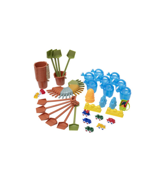V písku vznikají ty nejkrásnější věci. Ať už si hrajete se závodním autem nebo prodáváte zmrzlinu – fantazii se meze nekladou. Po hraní lze vše rychle a bezpečně uložit zpět do odolné tašky se dvěma držadly. Rozsah dodávky: 10 rýčů (55cm), 20 malých lopatek, 14 kbelíků 8 krhliček, 8 autíček, formičky na stavění hradů 6 ks, sada pro zmrzlináře 8 ks (kornoutky, skleničky, kulatá naběračka, nádoba na zmrz.