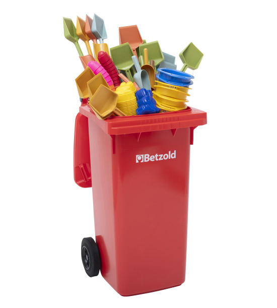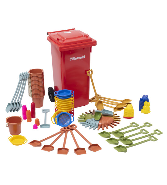 V písku vznikají ty nejkrásnější věci. Ať už si hrajete se závodním autem, kopete tunel, stavíte město nebo prodáváte zmrzlinu – fantazii se meze nekladou. Úložný kontejner z pevného plastu umožňuje vše bezpečně uložit. Díky kolečkům lze veškeré vybavení snadno přepravit na určené místo. Rozsah dodávky: 30 lopatek, 20 rýčů, 35 formiček (zvířátka), 30 mističek (kopečků), 15 sítek, 20 kbelíků, 1 úložný kontejner.