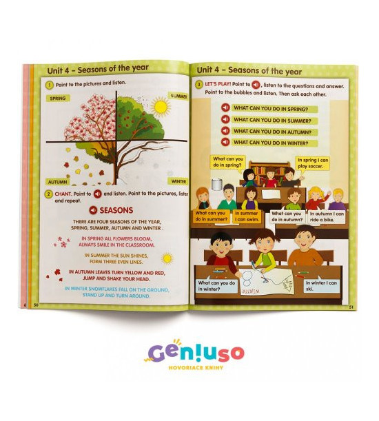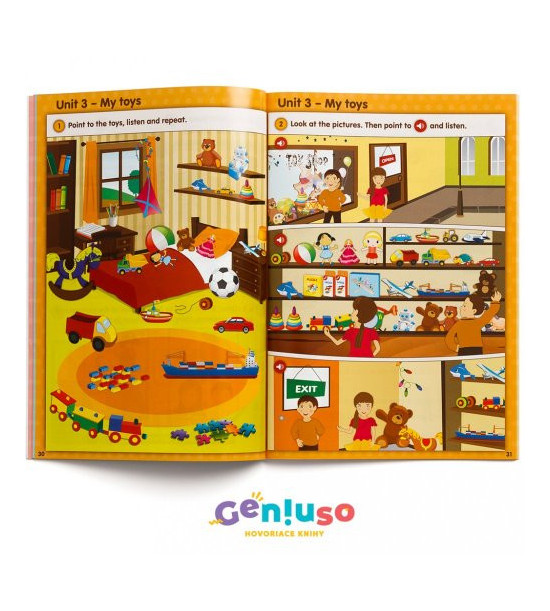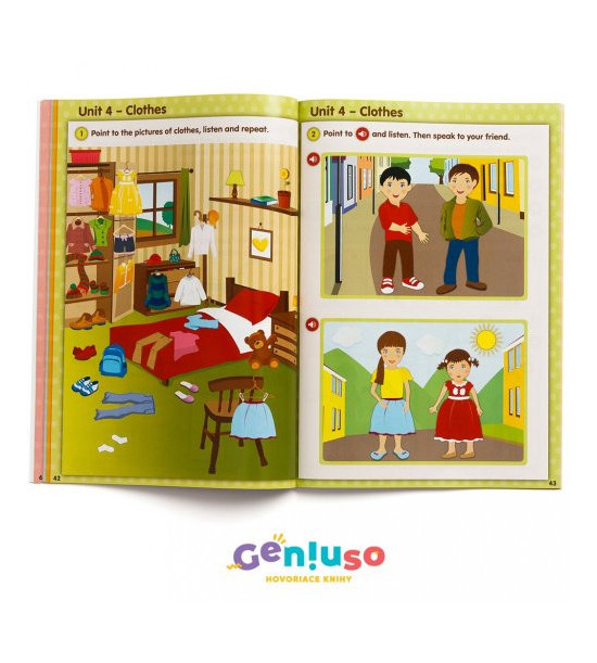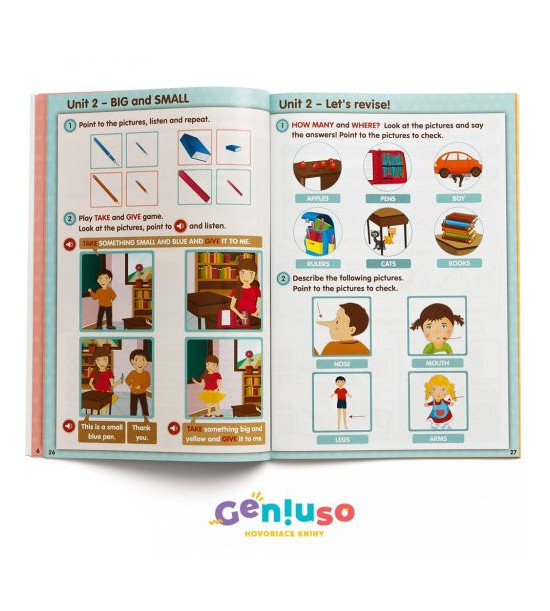 Učebnice se skládá ze šesti modulů, které jsou koncipovány tematicky jako úvodní kurz anglického jazyka. Moduly zohledňují kognitivní úroveň žáka mladšího školního věku. Učebnice obsahuje spoustu říkanek a úkolů. Poslechem a opakováním jazykových struktur umožňuje efektivní učení se vizuálním, auditivním i kinestetickým způsobem. Mluvící učebnice Click 1. Interactive English má spolu s pracovním sešitem doporučující doložku ministerstva školství. Témata: Colours, Numbers (1 – 10), My Family, My Toys, Animals, Clothes, Seasons, Sports, Food, Birthday, Holidays (Christmas, New Year, Easter) UPOZORNĚNÍ: Kniha se prodává bez mluvícího pera. Mluvící pero Geniuso čte všechny mluvící knihy s logem Geniuso, resp. IRS, takže si jej stačí koupit jednou. Témata: Colours, Numbers (1 – 10), My Family, My Toys, Animals, Clothes, Seasons, Sports, Food, Birthday, Holidays (Christmas, New Year, Easter) UPOZORNĚNÍ: Kniha se prodává bez mluvícího pera. Mluvící pero Geniuso čte všechny mluvící knihy s logem Geniuso, resp. IRS, takže si jej stačí koupit jednou. Pokud jej ještě nemáte, můžete si jej zakoupit samostatně nebo si k této knize zakupte i cenově VÝHODNÝ BALÍČEK obsahující mluvící pero.