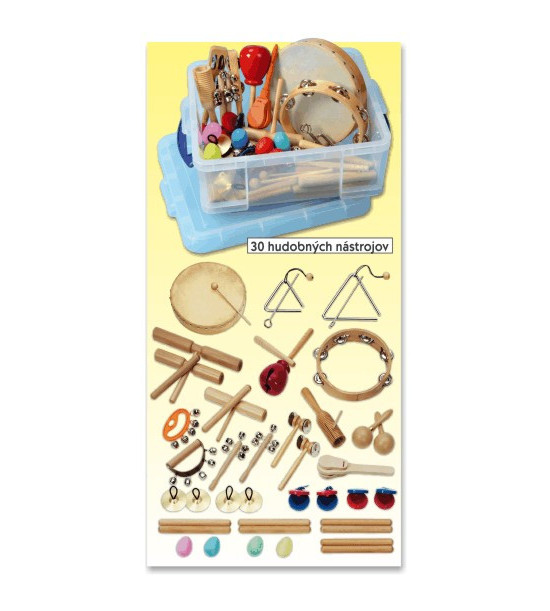 V hudební sadě Rytmus naleznete 30 dřevěných, kovových nebo plastových hudebních nástrojů pro každé dítě ve třídě. Ideální pro hudební výchovu. Baleno v plastové krabici 48 x 38 x 20cm. Obsah: - 1x bubínek (20cm) - 2x triangl (10 - 15cm) - 1x tamburína (20cm) - 1x tónovací dřívko Tulip - 1x čtyřité tónovací dřívko - 1x dvojité tónovací dřívko - 1x dřevěné Guiro s paličkou - 1 dřevěná kastaněta - 2x ruční zvonky - 2x zvonky s dřevěnou rukojetí - 4x kastaněty - 2 páry prstové činelky - 4 páry ozvučné paličky - 4x mini vajíčka Maracas.